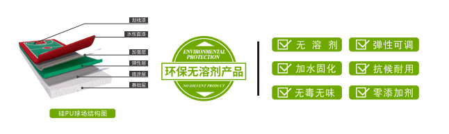 突破传统硅PU生产技术弊端,研发生产出环保无溶剂硅PU球场。硅PU(Spu)是一种以单组份高分子结构改性有机硅聚氨酯组成缓冲回弹结构,环保水性面漆作为耐磨面层,具备上硬下弹结构特征并能直接在水泥或沥青基础上施工的健康型专业弹性合成球场面层材料。硅PU从根本上有效地解决了PU球场材料在专业性能、环保施工、使用寿命、日常维护等方面的不足,具有革命性的创新性能,是各方面无懈可击的新一代环保产品。