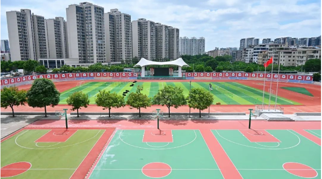 无溶剂硅PU球场在花广学校的“惊艳”亮相,不仅成为了学校一道靓丽的风景线更为学生们的运动提供了愉悦心情和高标准的场地支持。