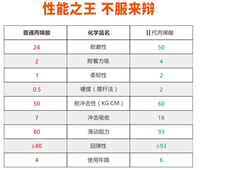 二代柔性丙烯酸材料,经我司千锤百炼,在普通丙烯酸球场材料的基础上做出了突破和改进,终于研制成功。1代丙烯酸材料使用年限比普通丙烯酸材料提高了40,底层拥有的附着力层是普通丙烯酸材料的2倍。面层拥有超强的耐磨性和防刮花是普通丙烯酸的5倍,可用于轮滑专用场地与看台专用涂层。在伸缩和裂缝产生的爆裂现象问题上,1代柔性丙烯酸材料特有的微弹和微韧性,能有效改善爆裂现象,I代丙烯酸将丙烯酸球场材料推向了一个新的高度。